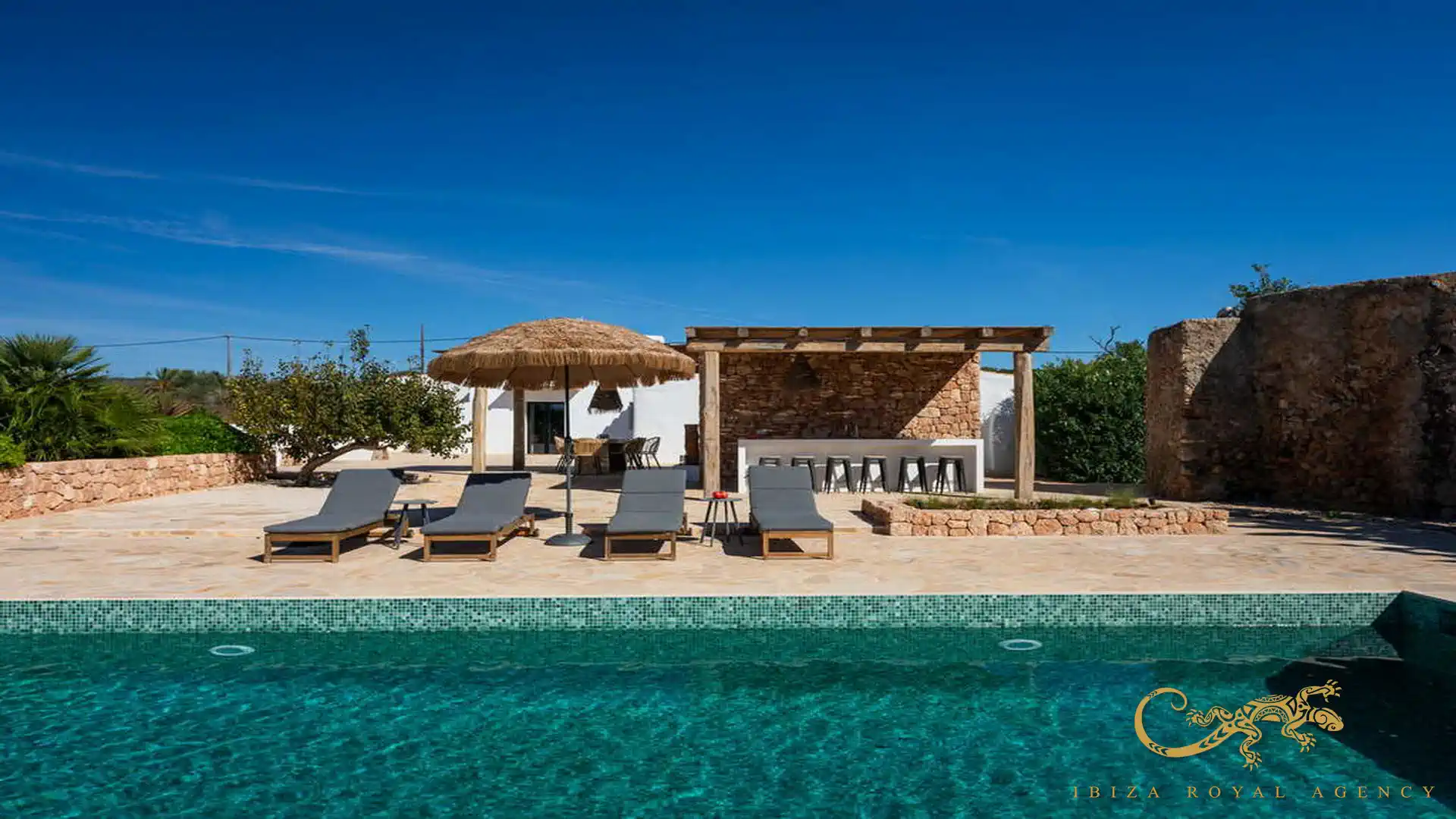 En el exterior, la finca ofrece un espectacular entorno natural con amplias terrazas, zona chill out, comedor al aire libre y una impresionante piscina de más de 90 m² rodeada de tumbonas y jardines mediterráneos. La elegante valla perimetral asegura la privacidad, mientras que los detalles en madera y la arquitectura blanca típica realzan el ambiente ibicenco.